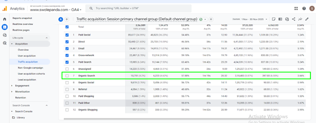 The contrast between the baseline data (February 2023) and the post-SEO performance (November 2025) is transformational. Organic Search has moved from the 3rd-ranked traffic channel to the 7th but this ranking reflects relative share in a dramatically larger pie, not a decline in performance. In absolute terms, the growth is exceptional.