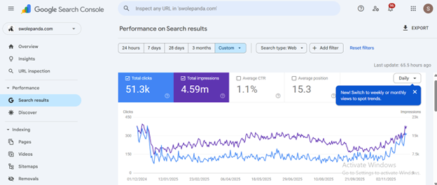 | Total Impressions | 4,590,000+ | The site appeared in Google search results 4.59 million times |
